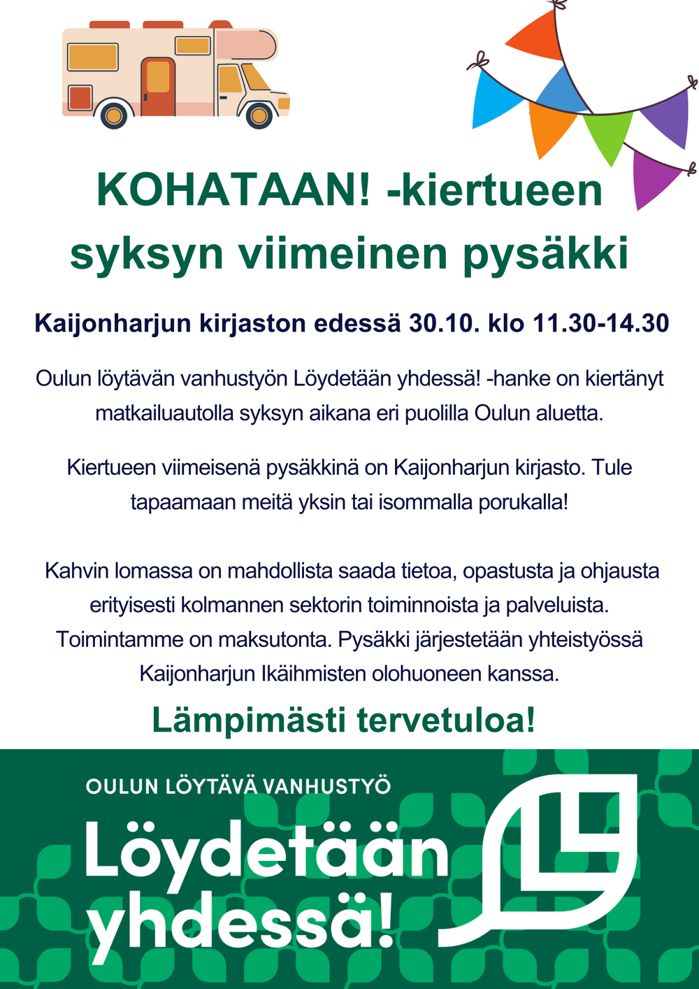 Tule tapaamaan meitä asuntoautollemme – kierrämme eri puolilla Oulun aluetta tarjoten ikäihmisille tukea, ohjausta ja kuuntelevaa kohtaamista. Toimintamme on maksutonta, eikä aikaa tarvitse varata.