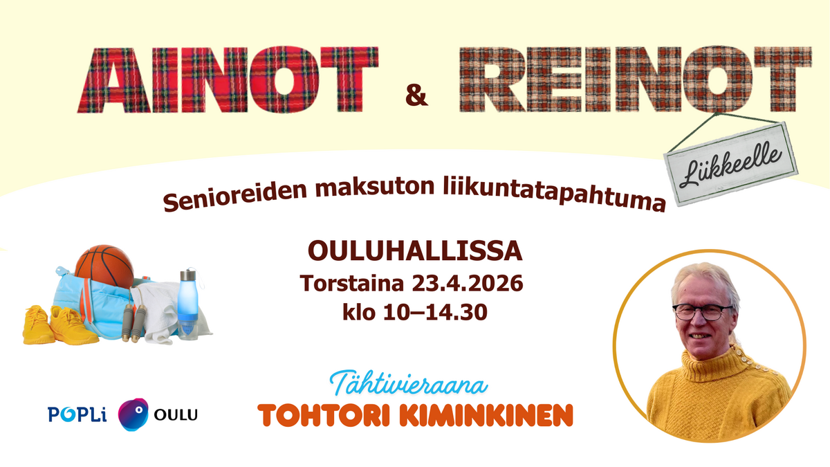 Oulun löytävän vanhustyön verkosto on mukana ikäihmisille suunnatussa Ainot ja Reinot -tapahtumassa! Tapahtumassa kävijöillä on mahdollisuus tutustua eri toimijoiden pisteisiin, sekä saada ajankohtaista tietoa terveydestä ja hyvinvoinnista.